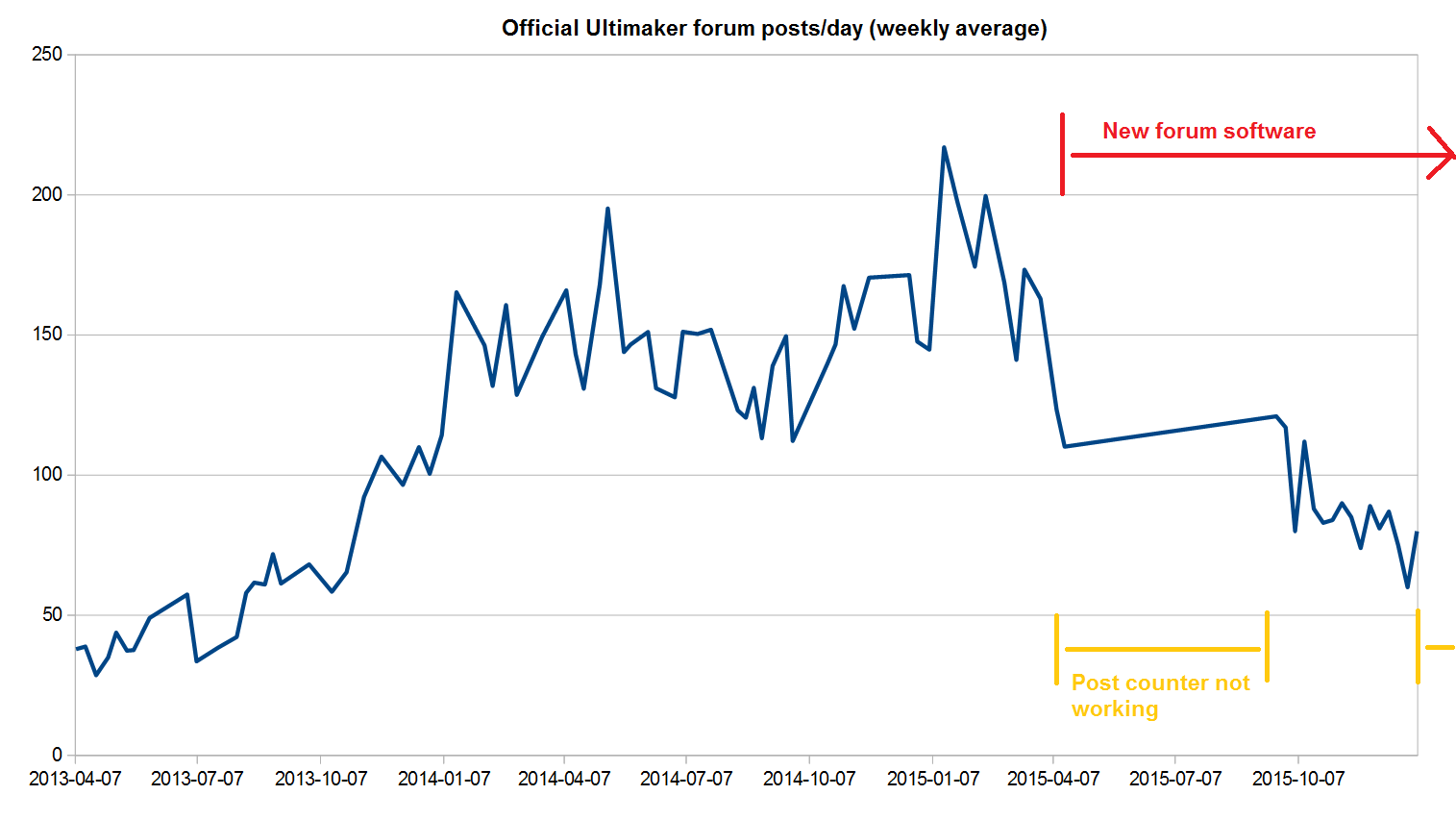 So, here are the numbers I have managed to collect so far, clearly showing what impact the new Ultimaker forum software had on the community: