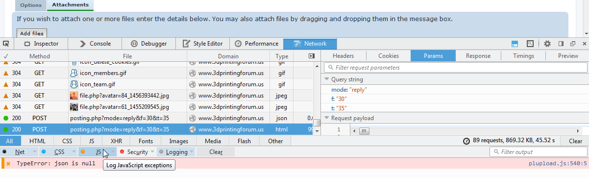 So here is the story: The file is uploaded in chunks and the browser expects a JSON reply. But with Anders' file, the response to the second chunk is empty, and the javascript (in the browser) crashes with a TypeError.