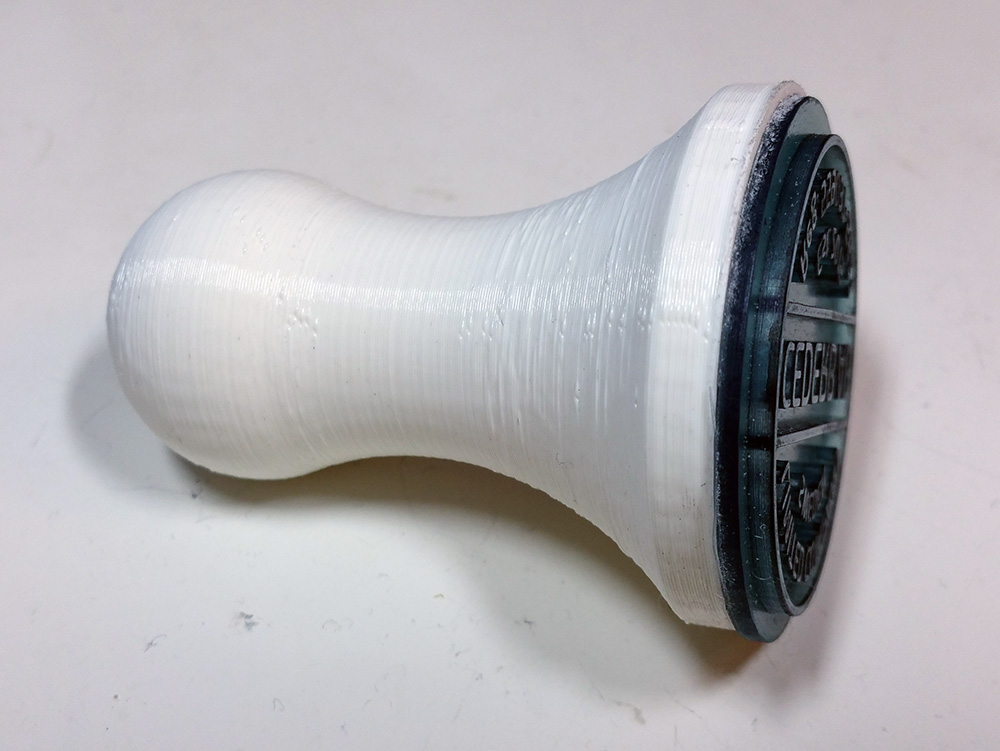 The handle is printed in some white crappy PLA really fast (15mm3/sec with 0.6mm nozzle, thin walls and 20% infill), and the stamp surface is printed in Formlabs tough resin on the Form1+