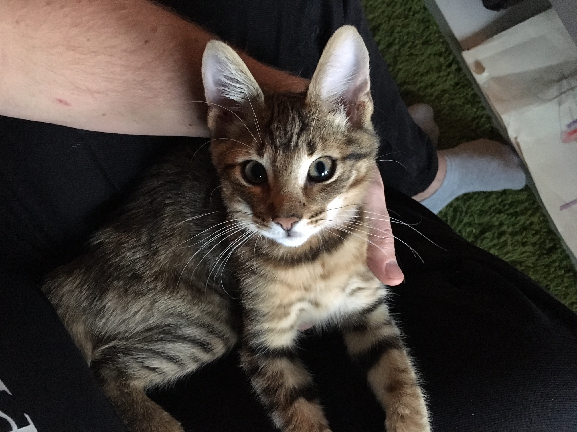 Molly went through a growth spurt, so she's a much bigger kitten now, but struggles to be coordinated.