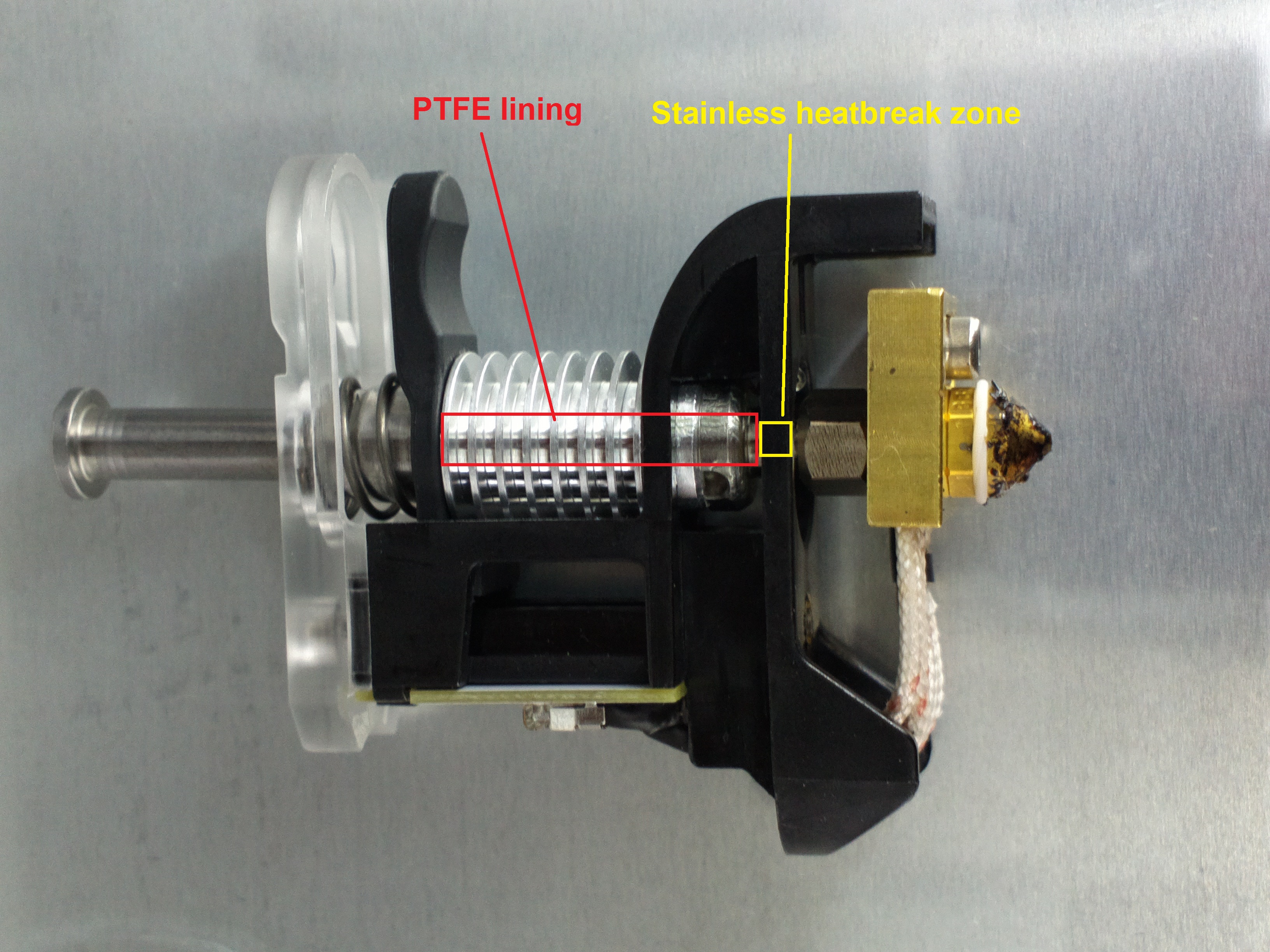 - there is a thin tube of PTFE (Teflon) which sits in an alu housing with lot of cooling rips to make sure it will kept below ~200°C.